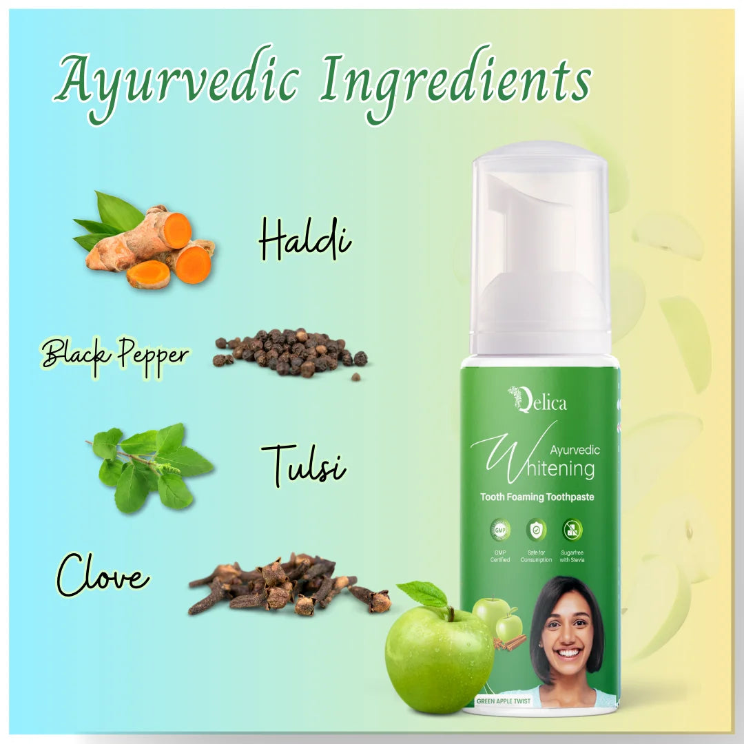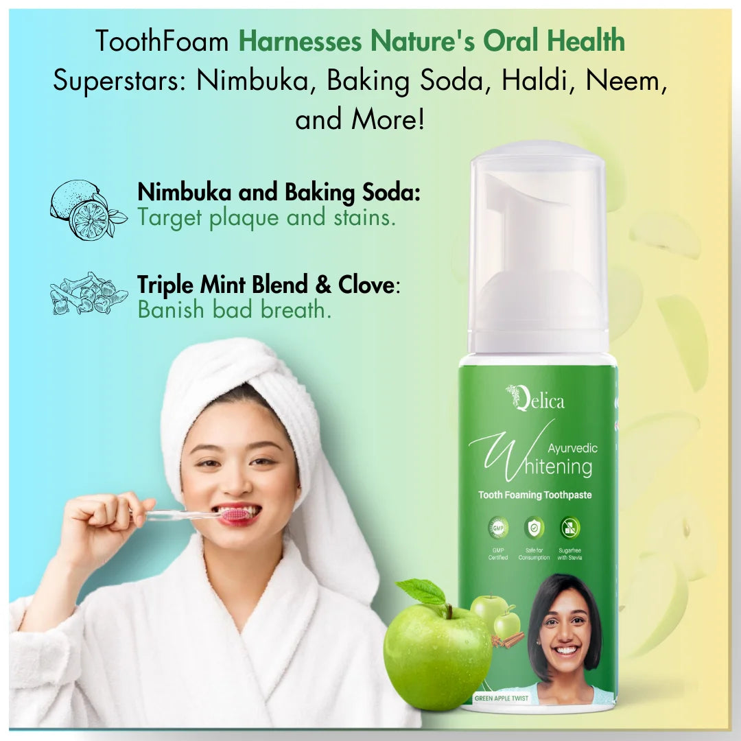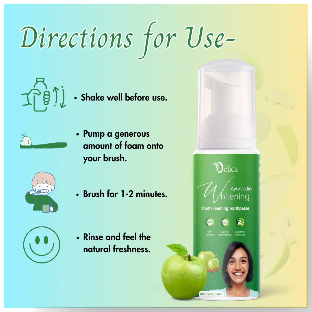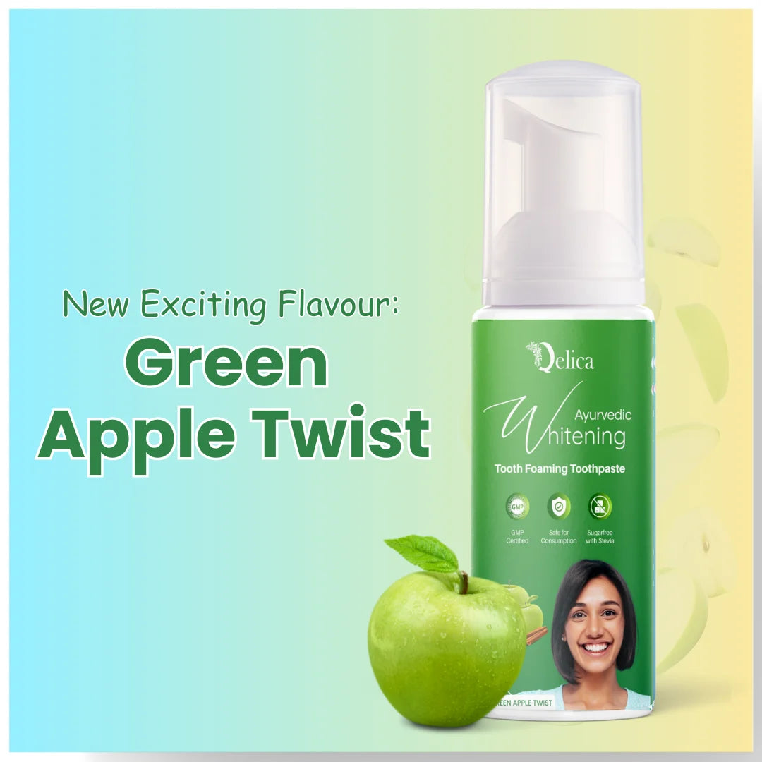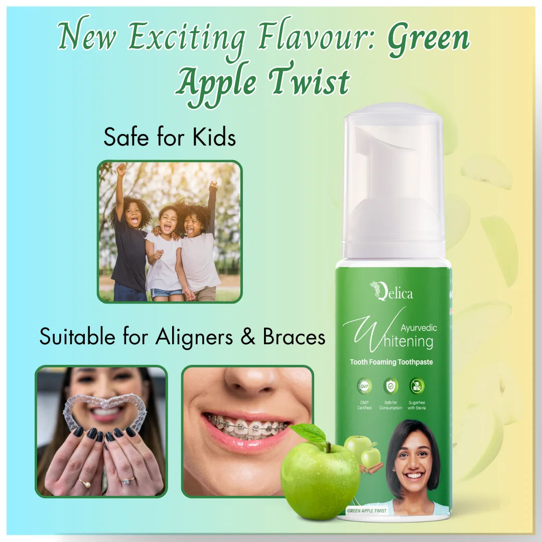 Introducing our Teeth Whitening Foam in the refreshing Green Apple Twist flavor. This innovative product combines natural ingredients to deliver effective teeth whitening and comprehensive oral hygiene.